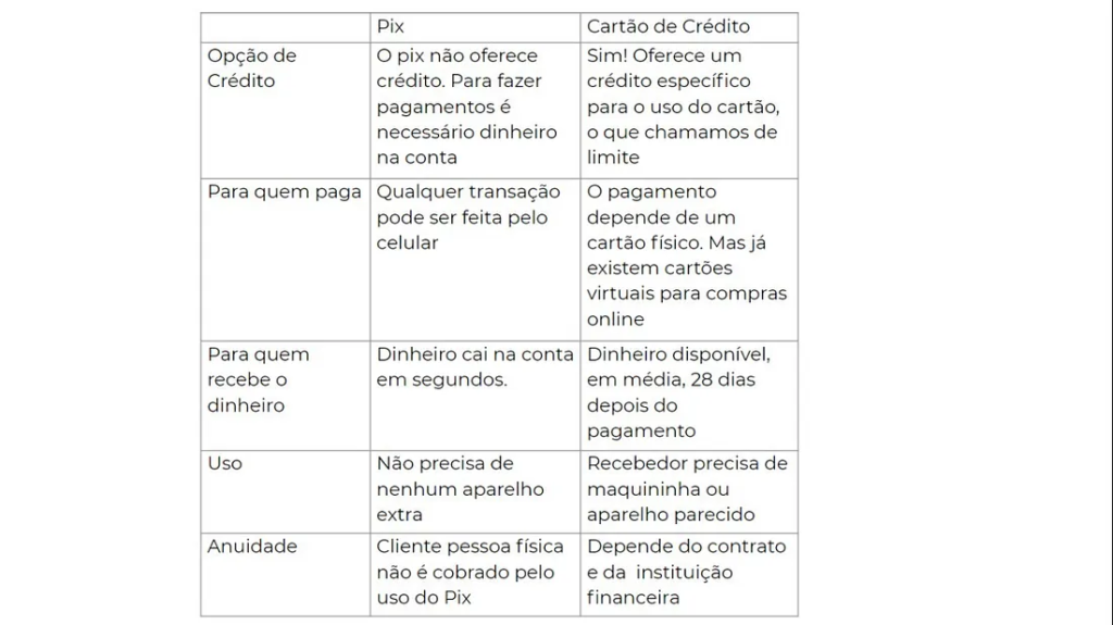 Já o cartão de crédito segue em uso, pois o Pix não oferece crédito. Todos os pagamentos e transferências são feitos a partir do saldo disponível em conta.