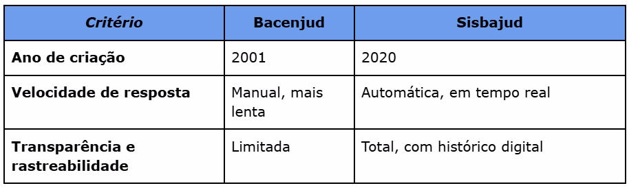 Veja na tabela o comparativo entre o Bacenjud e o Sisbajud: